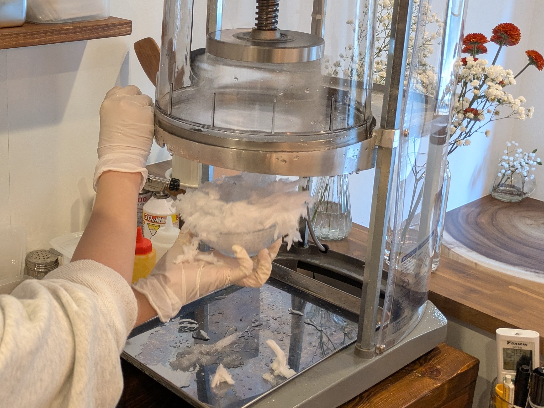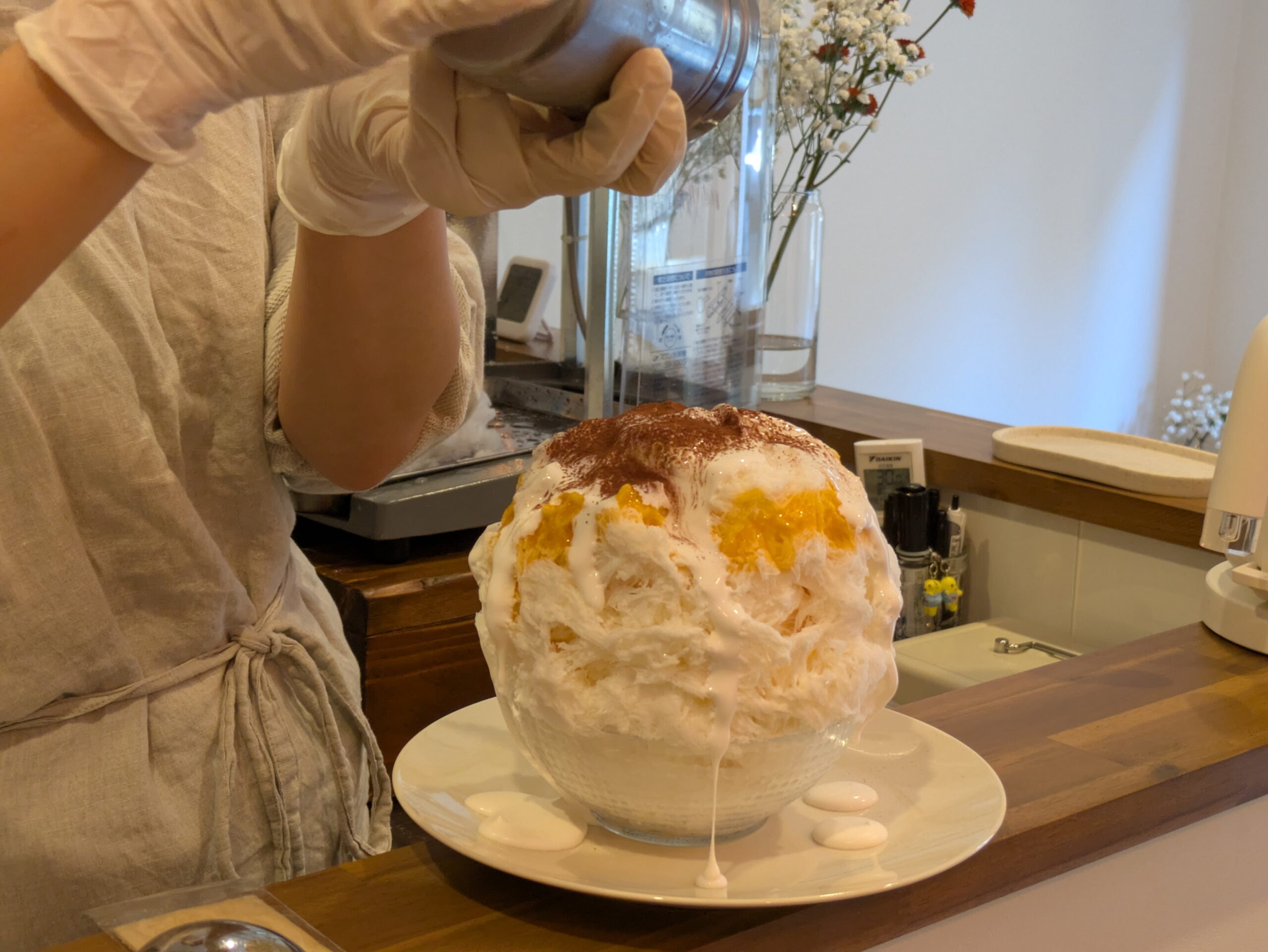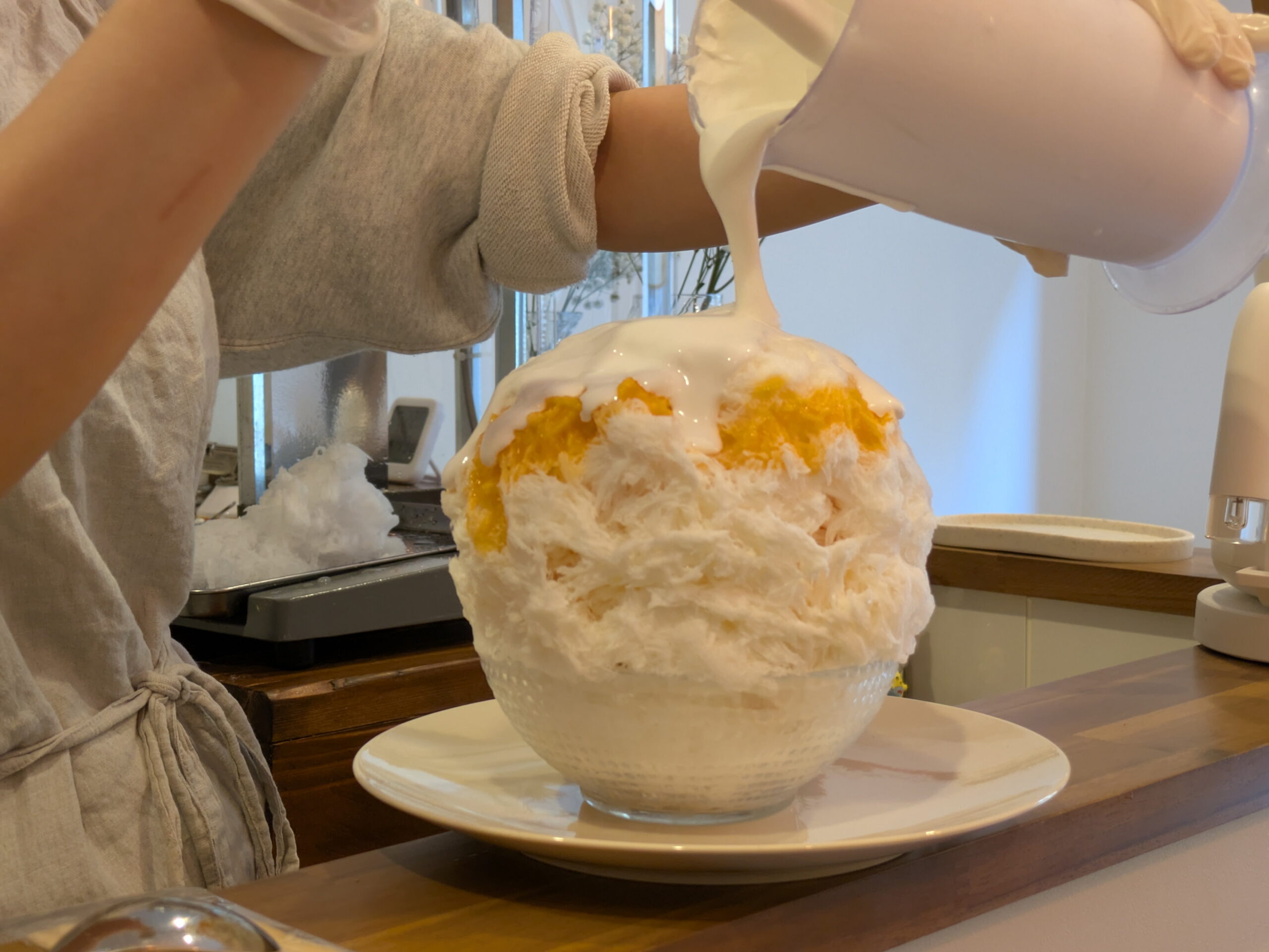 削られた氷にシロップをかけるシンプルなかき氷とは異なり、「こおりんぼう」さんのかき氷は、クリームや食材と、薄衣のような氷が層になって重なり合うように作られていきます。