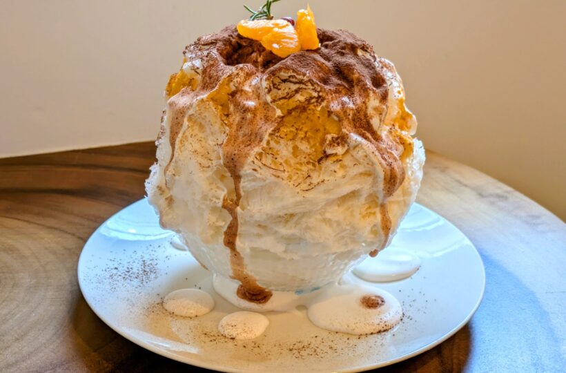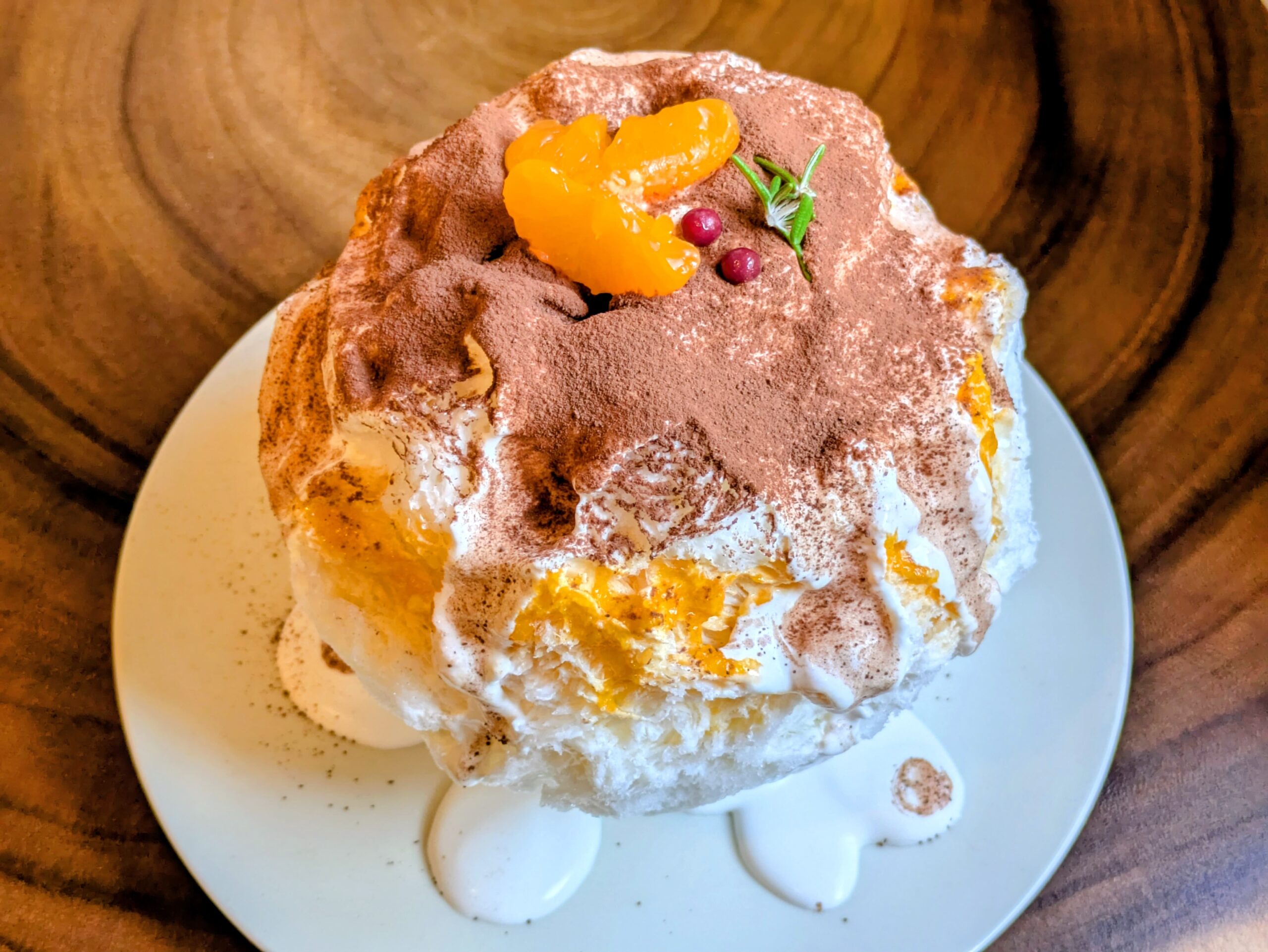 「おみかんティラミス」も、下層にはコーヒークリームとグラハムクッキーが置かれ、中ほどには温州みかんにマスカルボーネクリーム、それらを優しく氷が包みこみ、みるくシロップとみかんシロップ、生クリームがたっぷりと。