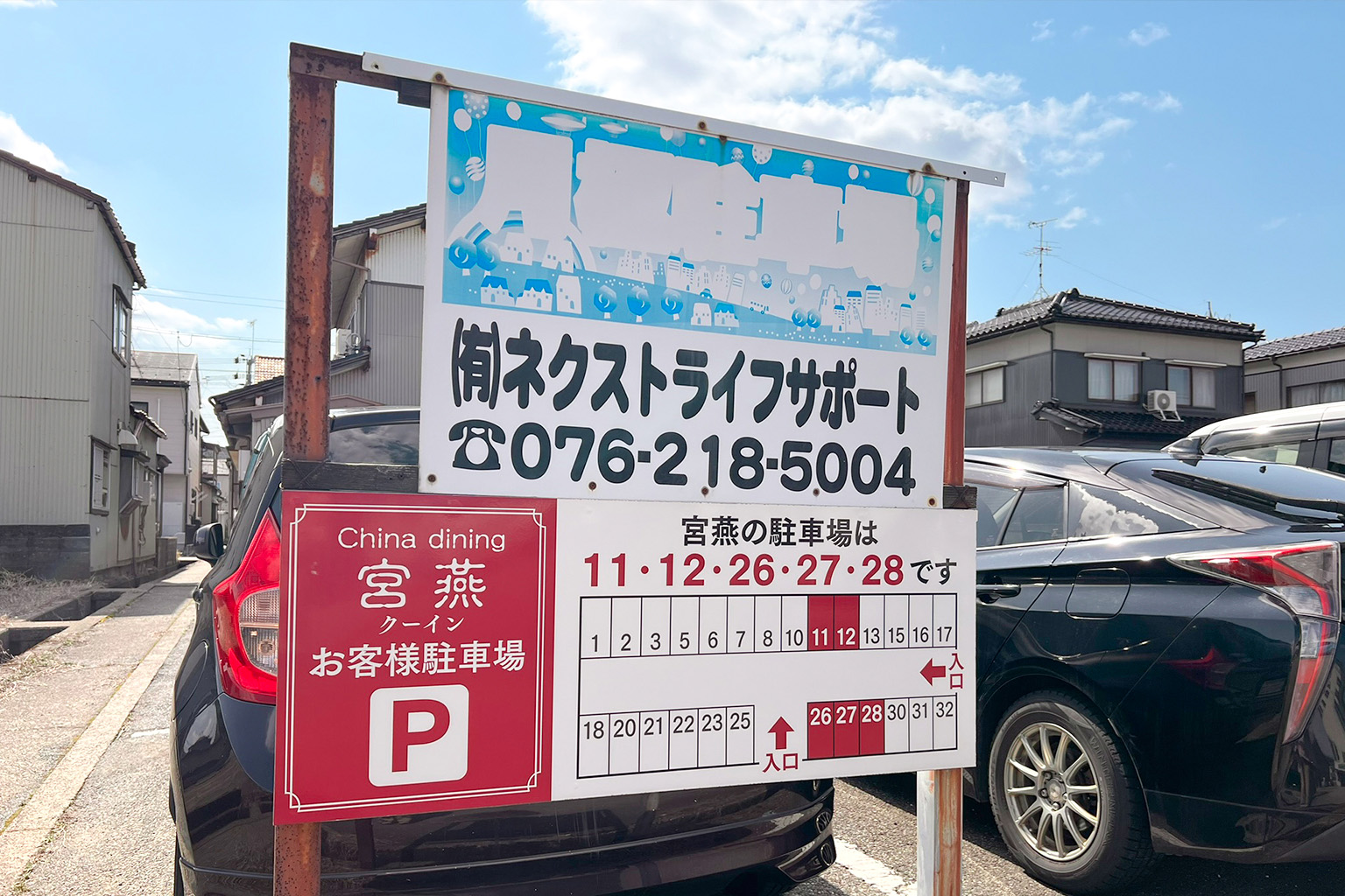 「China dining 宮燕(クーイン)」さんは、金沢市八日市のユタカビル1Fにある中華料理店です。駐車場はお店の前に2台、指定駐車場に5台の計7台分が用意されています。