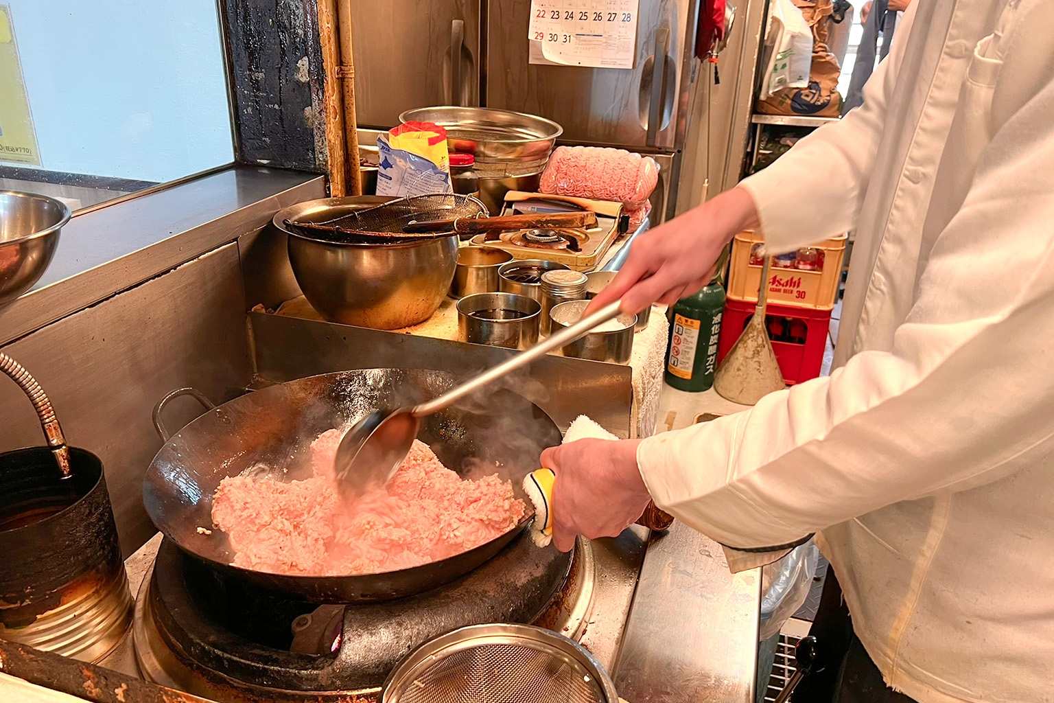大量のひき肉が入った重そうな鍋を、力強く炒めていく店主の姿はまさに圧巻。プロの手さばきに見入ってしまいます。