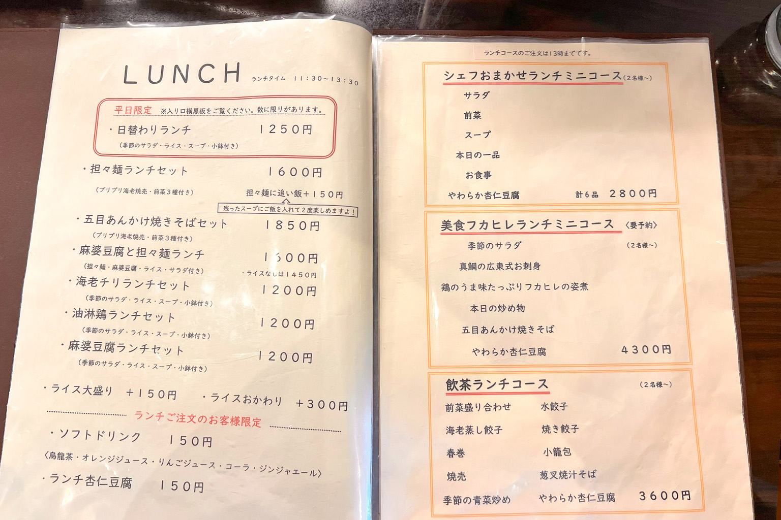 さらに、2名様から注文できるシェフおまかせランチミニコースや飲茶ランチコース、贅沢な美食フカヒレランチミニコース(要予約)まであり、ちょっとしたお祝いや特別な日のランチにも使えるのがうれしいポイントです。
