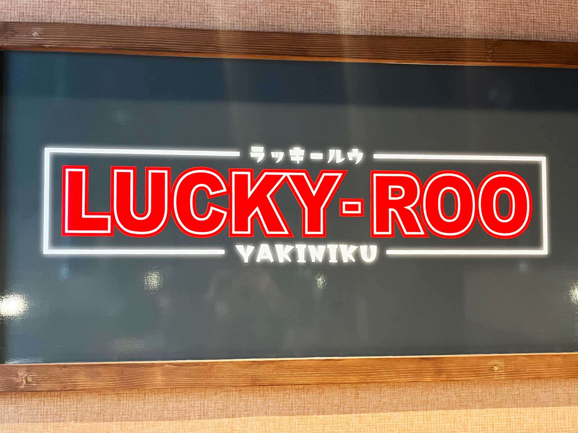 コンクリートを打ったような外観に、赤い文字で「LUCKY-ROO」と書かれた看板が目印。