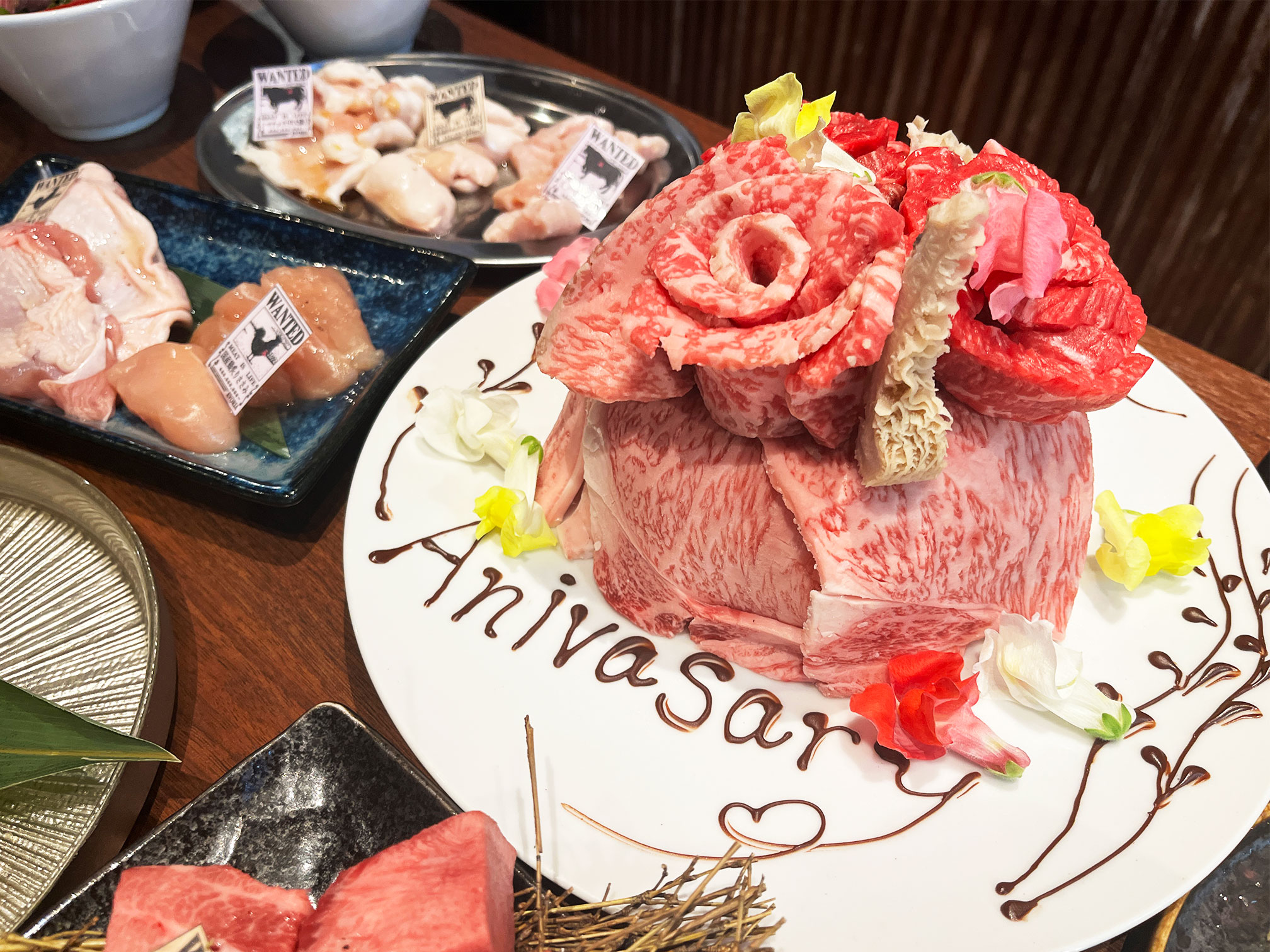 中でもやはり注目は肉ケーキ。華やかで、記念日感も抜群です。