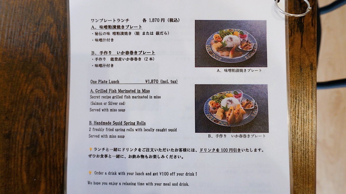 ランチメニューはこちら。ランチセットは1,870円(税込)からありました。彩り豊かなワンプレートランチの「秘伝の味 味噌粕漬焼き(鮭または銀だら)」がおいしそう! これ絶対うまいやつ!