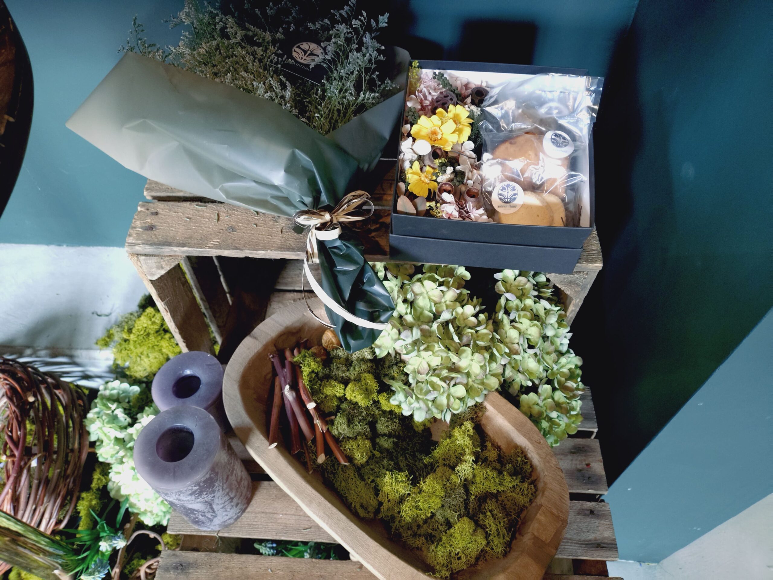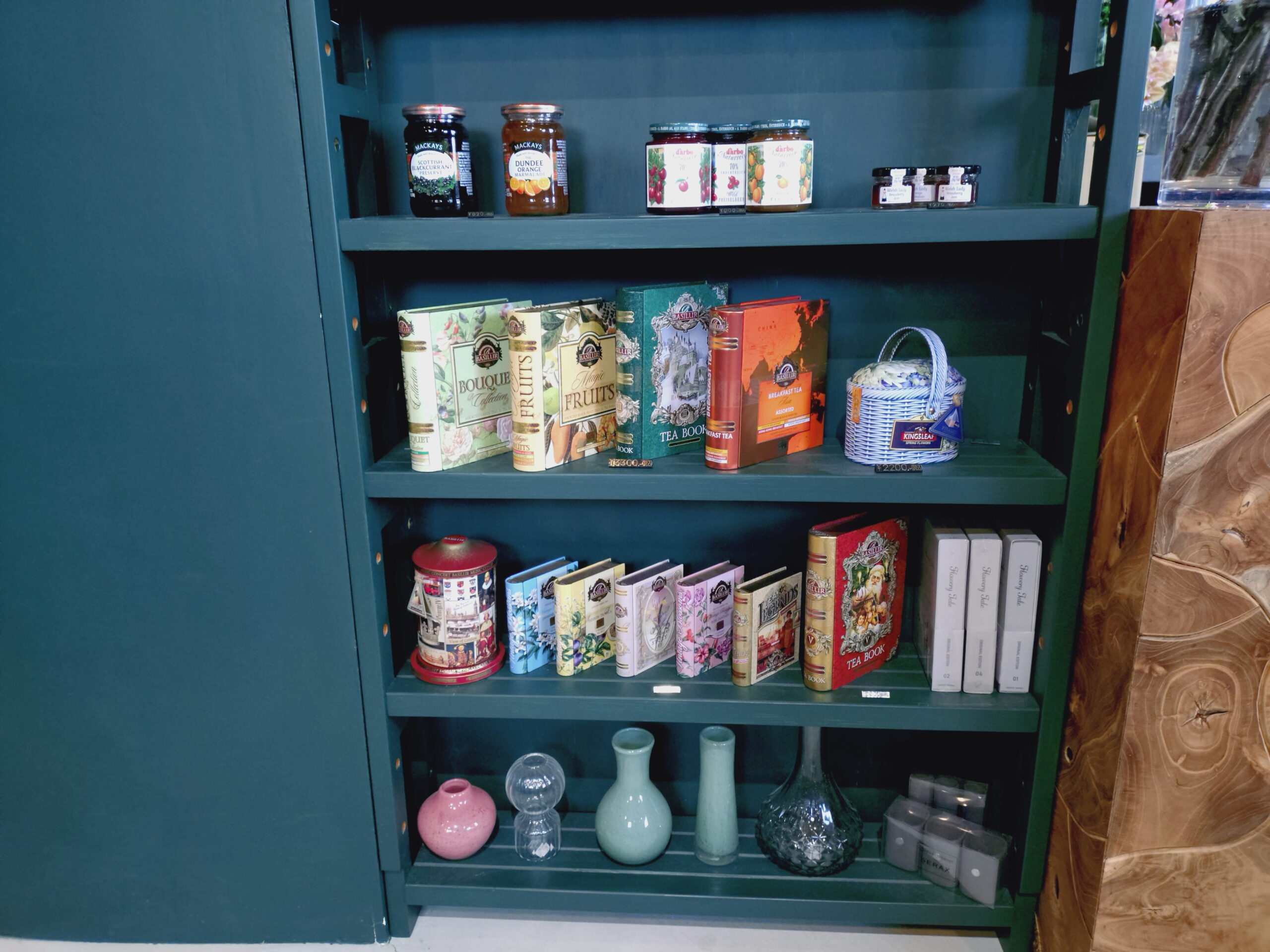 カウンター付近には「紅茶と花のコラボ商品」が並んでいます。お菓子、ジャム、紅茶+生花、ドライフラワーなどのカスタムセットがオーダー可能です。予算や好みに応じて作ってくれます。