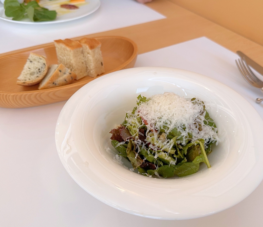 前菜は素材が見えないほどたっぷりとかけられたチーズと、旨味が凝縮されたベーコンが、野菜と良く合います。くるみの食感や香りも楽しく、この前菜だけでも「来てよかった!」と思わせてくれます。特に印象的なのが、たっぷりとかけられたオリーブオイル。しっとりとしたパンに含ませるだけで、手が止まらなくなるような存在感です。