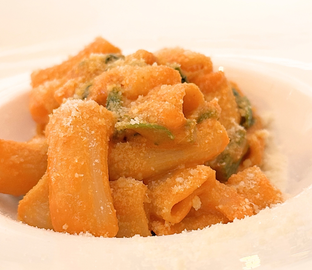 海老のトマトクリームソース(リガトーニ)は、濃厚でありながら重たくなく、トマトの旨味がまっすぐ伝わってきます。運ばれてきた瞬間からチーズの香りが立ち上り、食欲をそそられます。