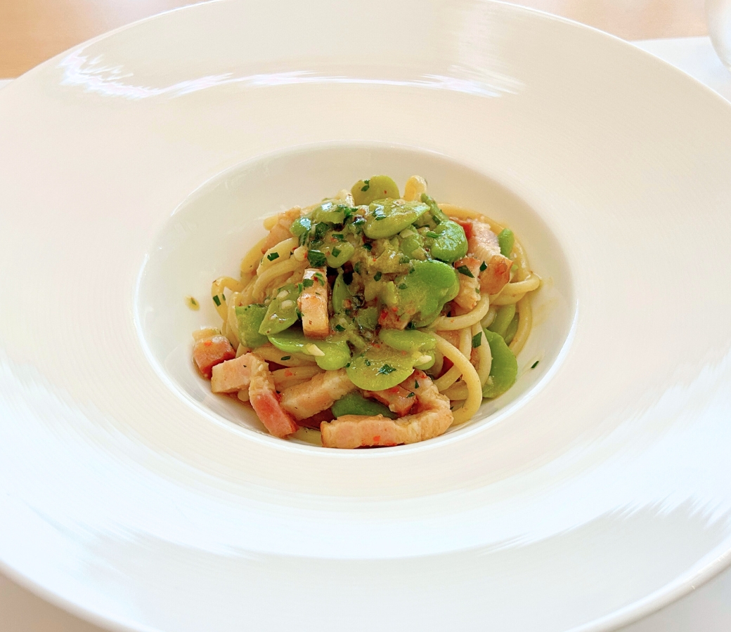 ベーコンと空豆のペペロンチーノは、見た目はシンプルですが、口に入れるとオイルの香りと素材の甘みが一体となって広がります。余計な味付けがない分、火入れや塩加減の繊細さが際立ちます。