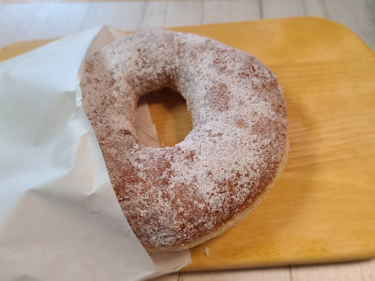 シュガーがたっぷりとまぶされた、大きなリング状の「もちべえ」。歯ごたえがしっかりあって、まるでおもちを食べているような、独特のもっちりとした食感が楽しめます。どこか懐かしく、小麦の甘みがダイレクトに伝わる味わいは、大人から子供まで幅広く支持される1品。定番のシュガーはもちろん、おすすめの「きなこ味」も注目です。