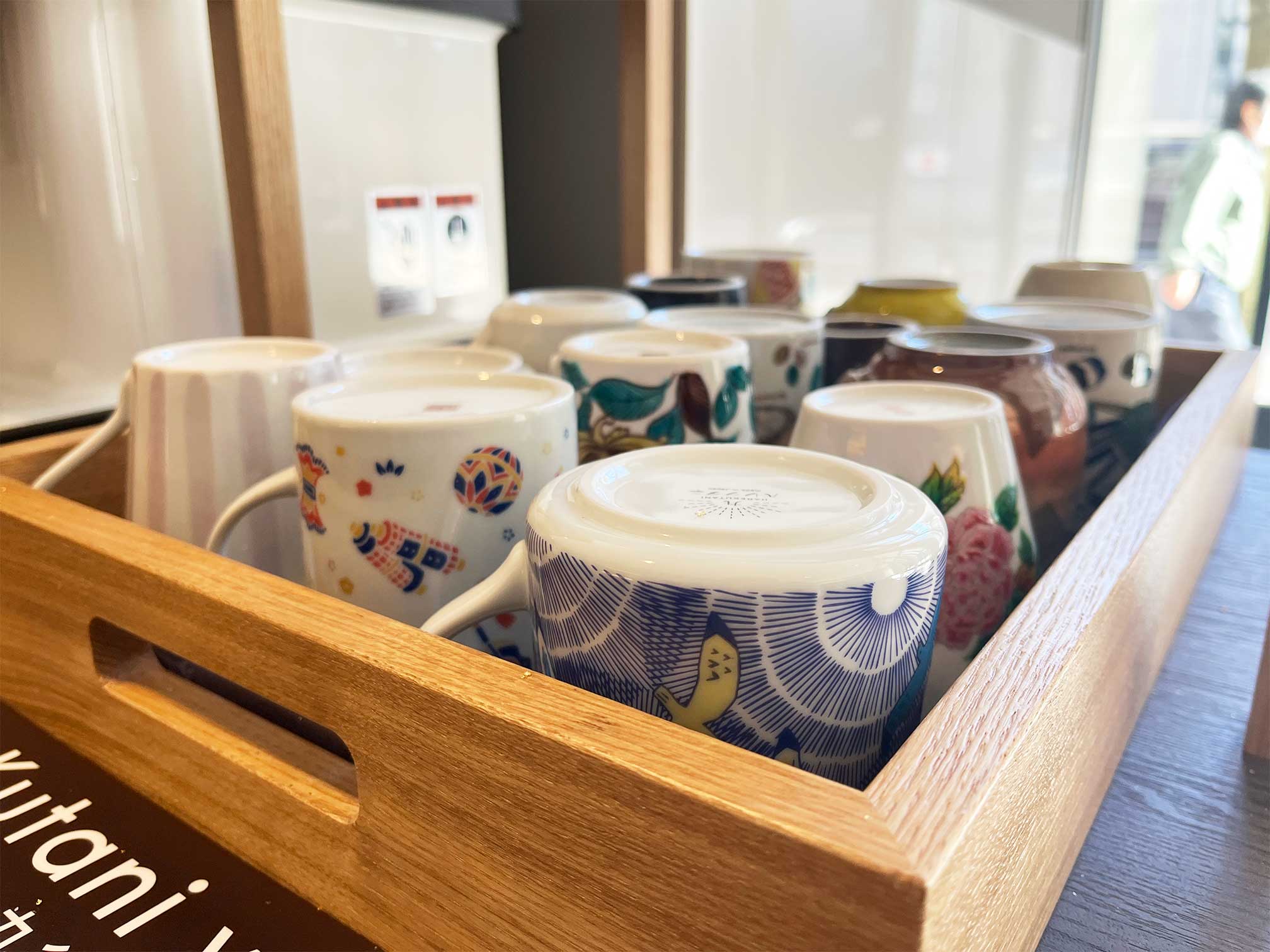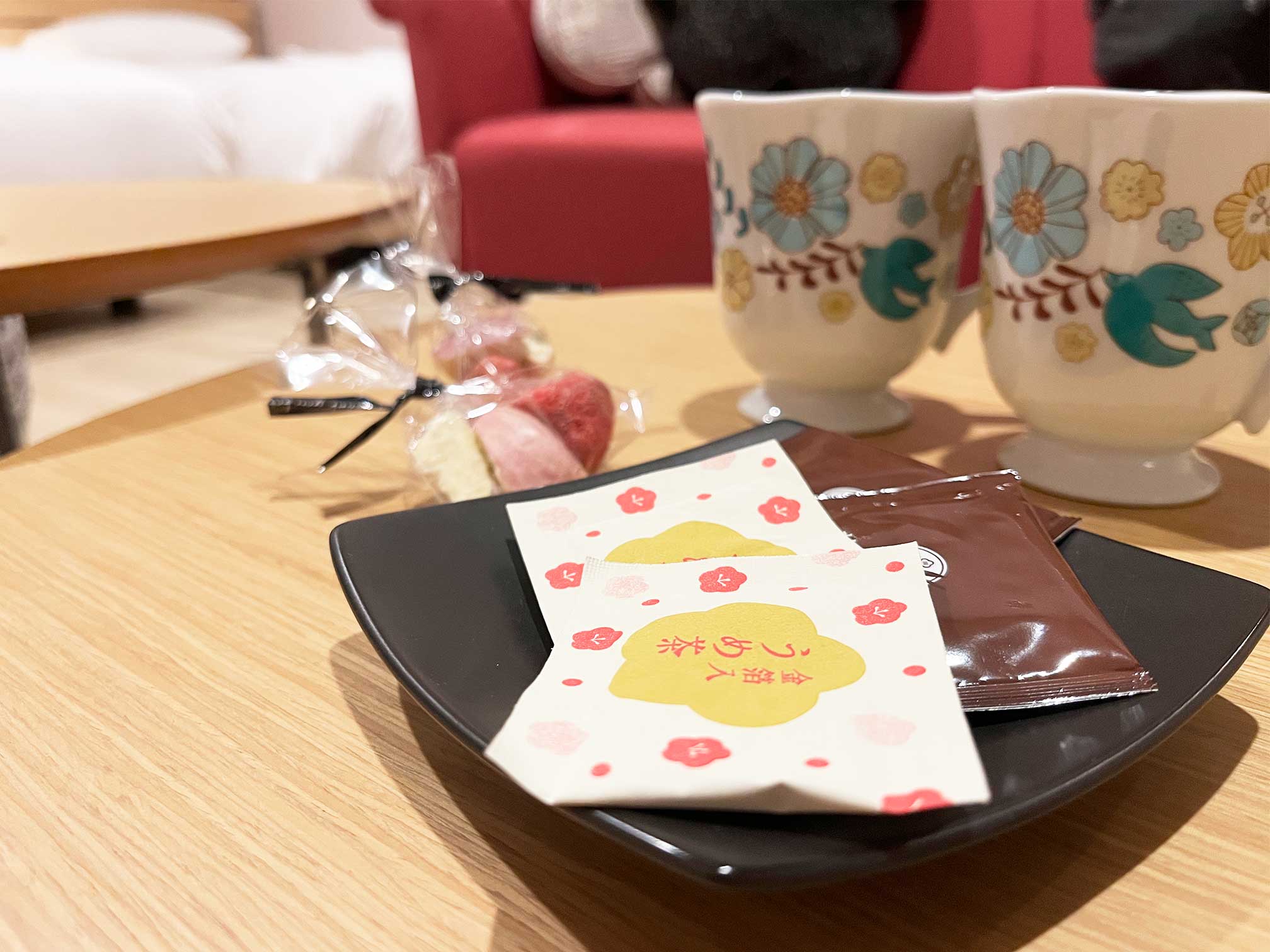 部屋には九谷焼カップもあり、金箔入り梅茶や金沢棒茶まで。石川らしさがギュッと詰まっています。