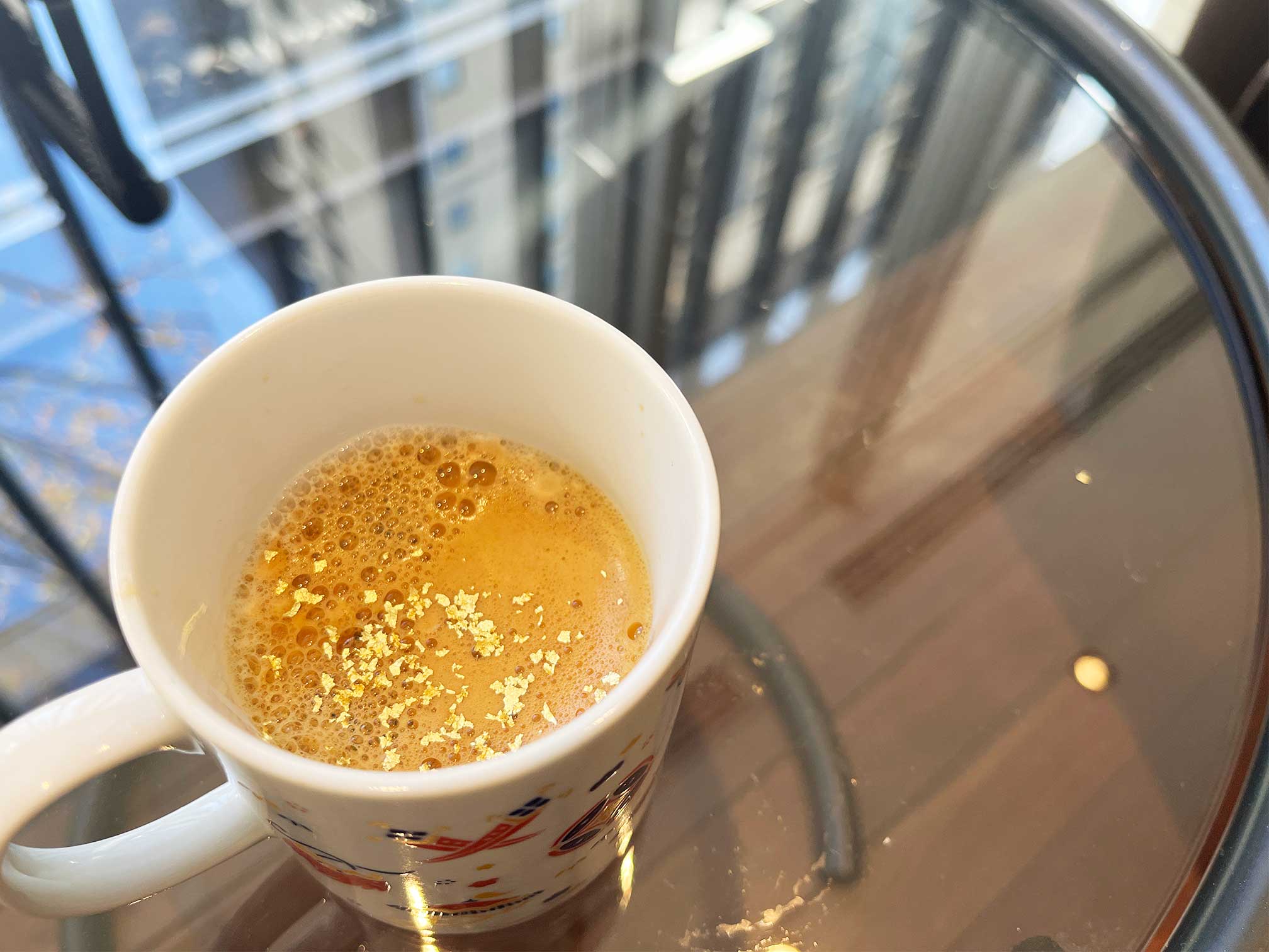 しかも、1つひとつ絵柄の違う九谷焼のカップを選んで注ぎ…なんと金箔をふりかけて飲めるんです!
