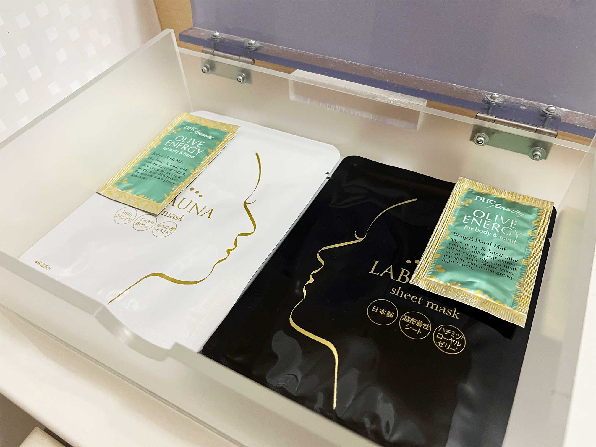 そしてフロントではクレンジング〜クリームのスキンケアセットを受け取れ、お部屋にはパックが朝用と夜用の2枚。荷物を減らせるし、テンションは上がるしで最高。