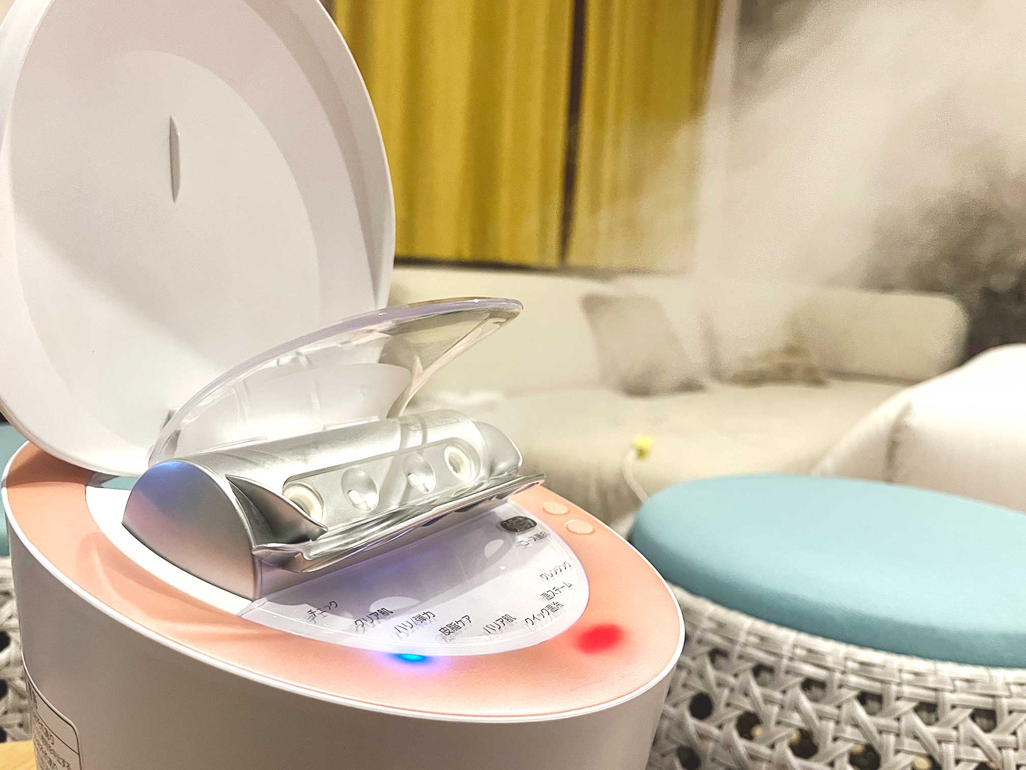 翌朝はスチーマーで肌を整え、キラキラドレッサーでメイク、ReFaアイロンで髪を整える…。