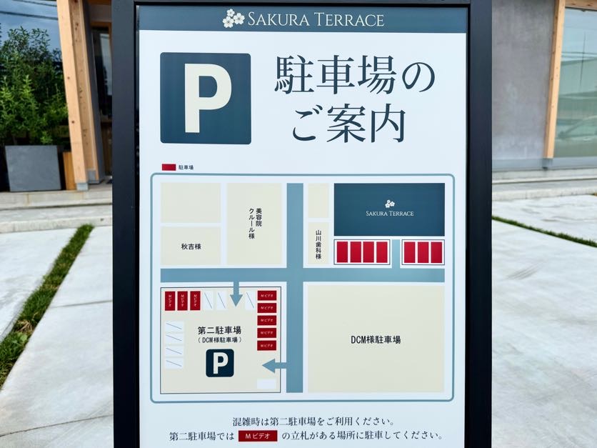 駐車場は、店舗前とDCMカーマの第二駐車場(場所指定)のあわせて15台分あります。