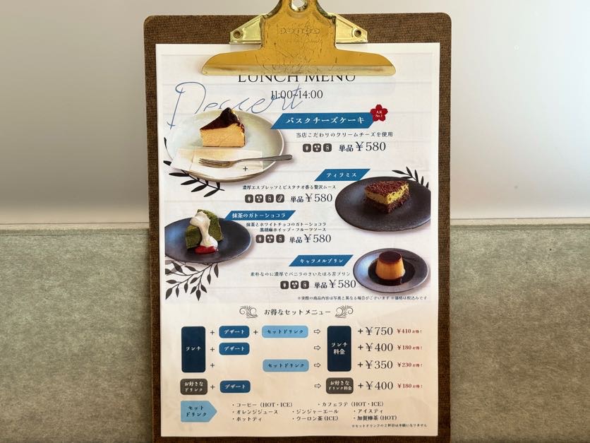 ランチメニューは洋食が中心で、デザートやドリンクをセットにできます。どれもおいしそうで迷ってしまいますね…。
