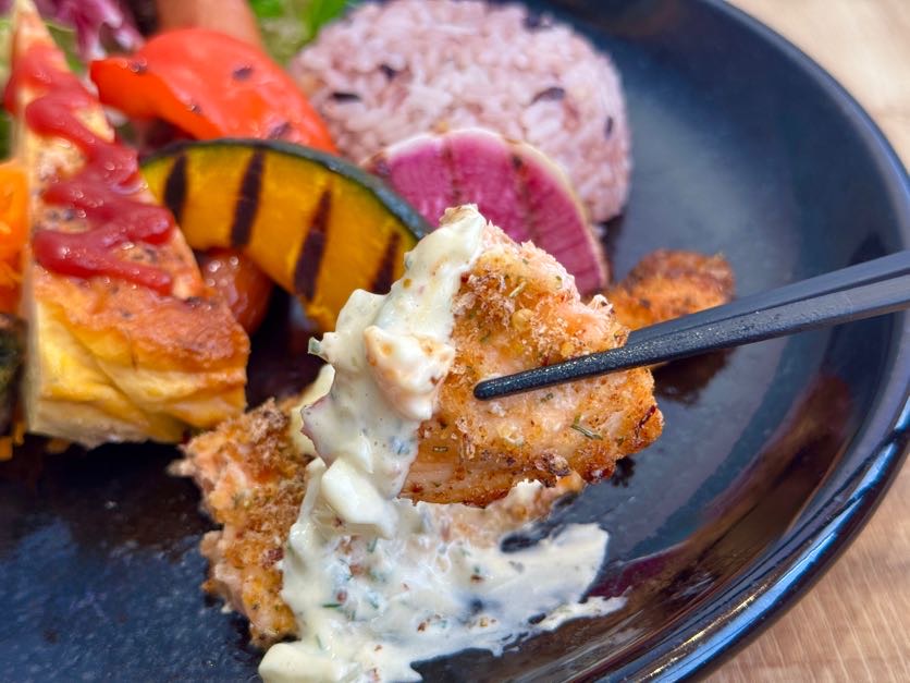 いざ、実食。メインは「サーモン香草焼き」です。これまではチキンでしたが、最近お魚に変更されたばかりなんだそう。ほどよい塩味で、タルタルソースともよく合います。