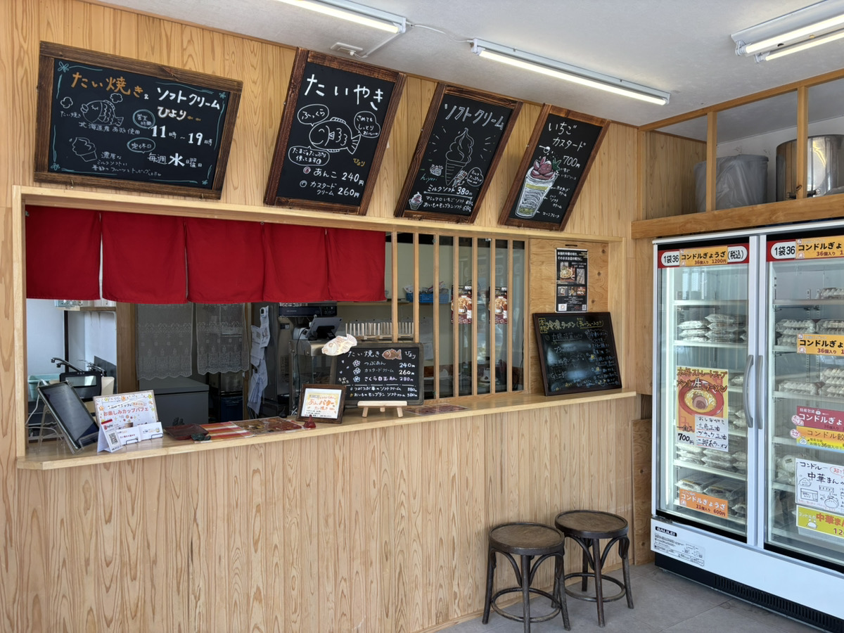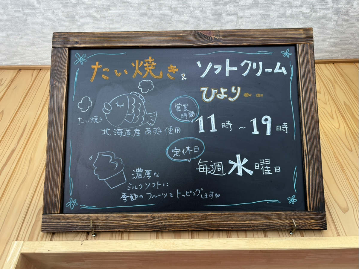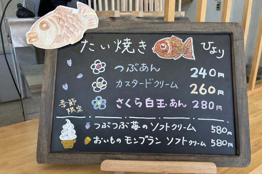 たい焼きに加えてソフトクリームも展開されており、黒板の手書きメニューからは、お店のやさしくあたたかな雰囲気が伝わってきます。