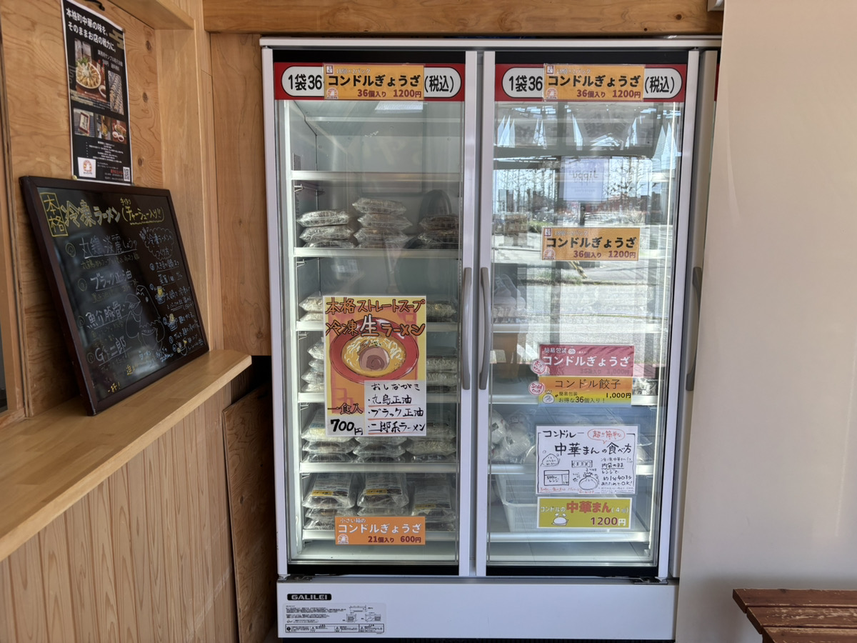 店の奥には大きな冷凍ショーケースが設けられており、「コンドルぎょうざ」などの商品が並びます。