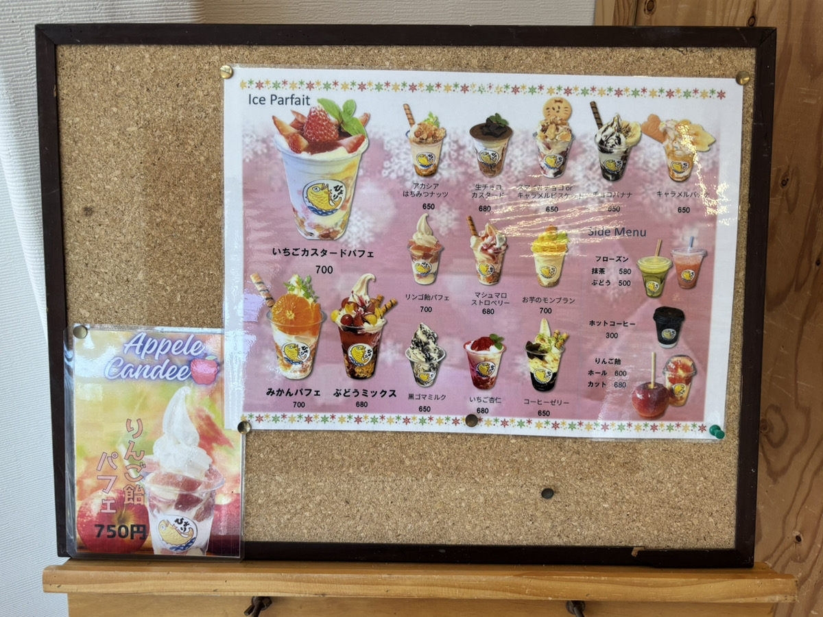 豊富なラインナップの中でも、「いちごカスタードパフェ」がひと際目を惹きます。おいしそう。