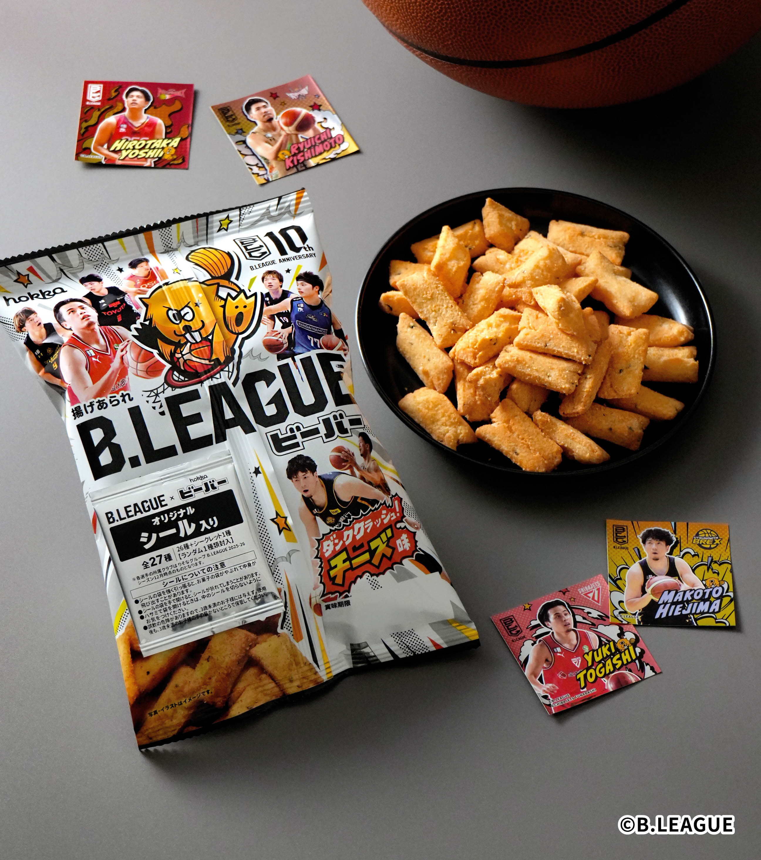 コクのあるチーズの旨みとビーバー特有のザクッとした食感が、まるでダンクシュートが決まる瞬間のような爽快感を演出します。パッケージには、B1クラブから注目選手をデザインしたオリジナルシールを1枚封入しており、どの選手が出るかは開けてからのお楽しみです!