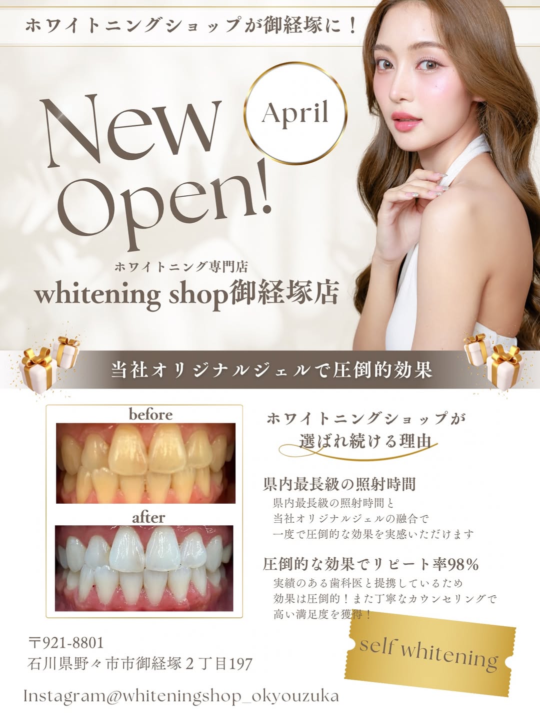 セルフホワイトニング専門店「ホワイトニングショップ」さんの2号店が野々市にオープンします。
