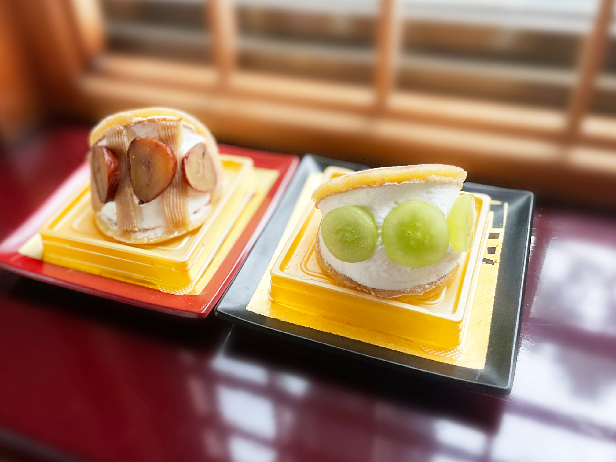 左の「能登栗」は、大きな栗の渋皮煮にモンブラン餡のトッピング。