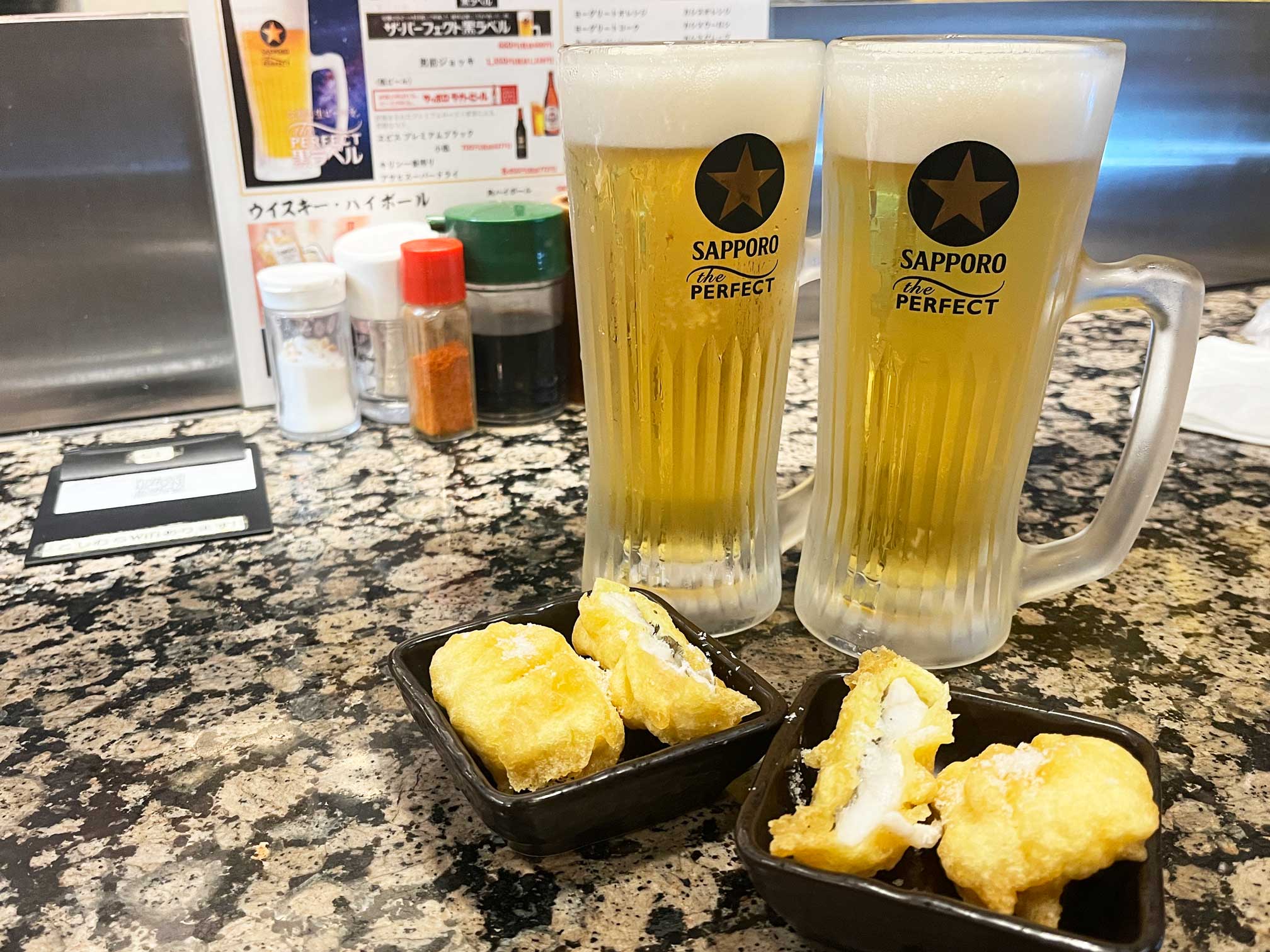 QRコードで注文を済ませると、まずは生ビールと付きだしが到着。