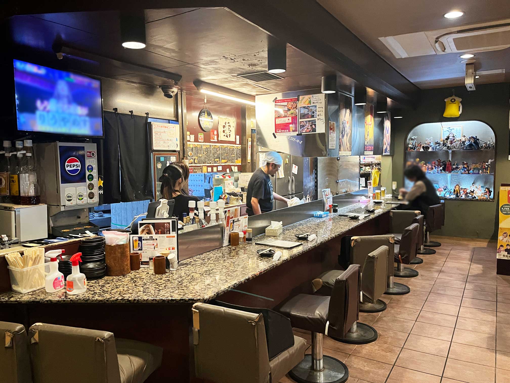 カウンター席・テーブル席・お座敷があり、カウンターでは「座席・座席・荷物置き・座席…」と、隣の人と直接隣り合わないような配慮がされています。