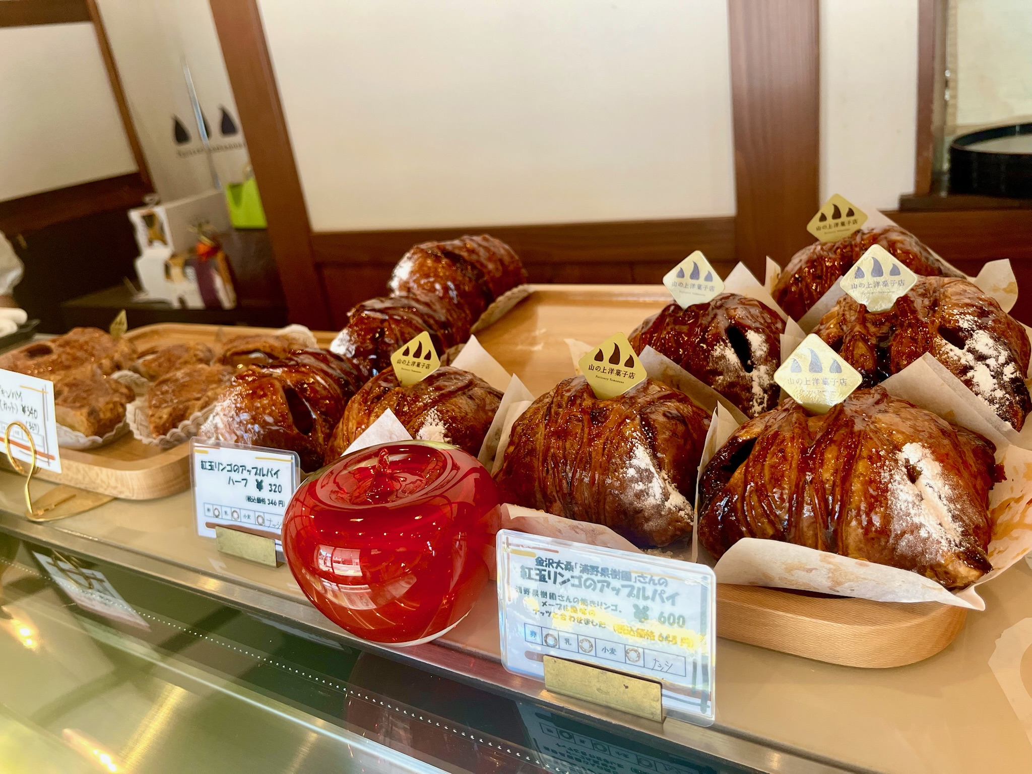 カウンターの上に並ぶパイは、丸くつやつやで、見ただけでおいしそう。