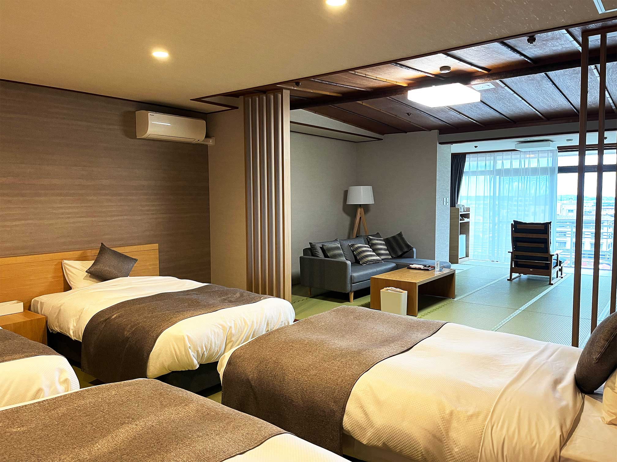 畳敷き+大きなベット、ソファまでついた和モダンなお部屋。眺めも良く、テレビではYouTube視聴もできます。