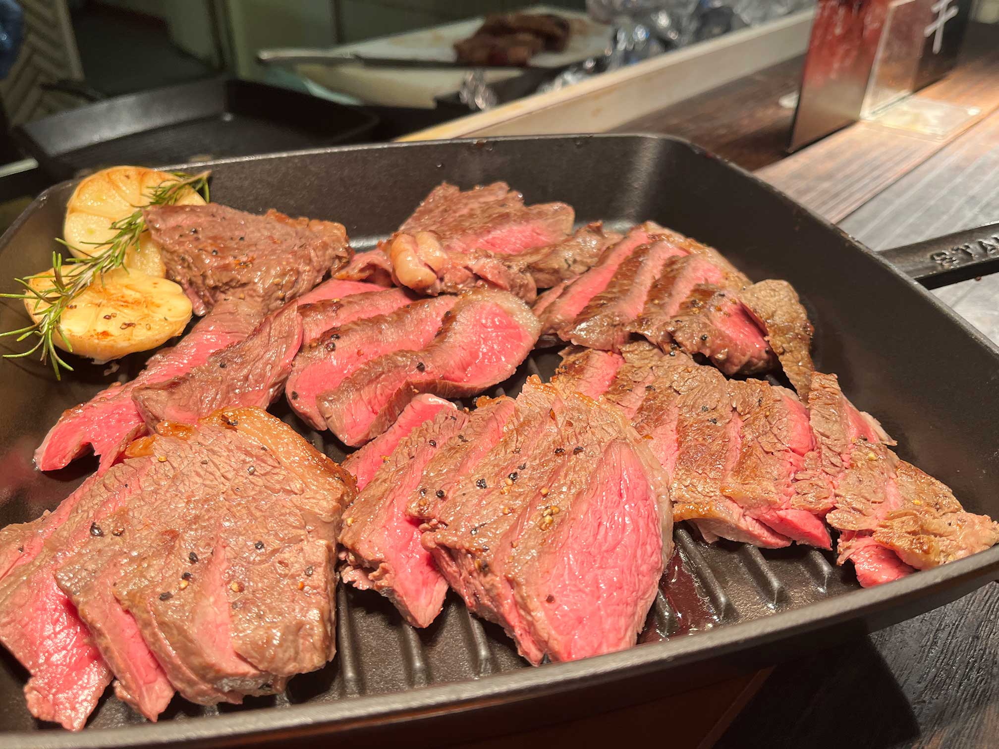 レア焼きで食べごたえがありつつもしっかりと噛み切れる品質の良いお肉。「バイキングの肉」の枠を軽々超えてきます。