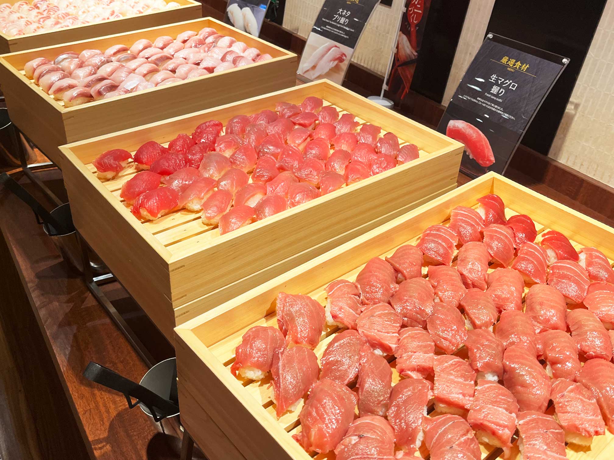 お寿司には天然本マグロの握りも並んでいて、かつ、ネタが大きい!