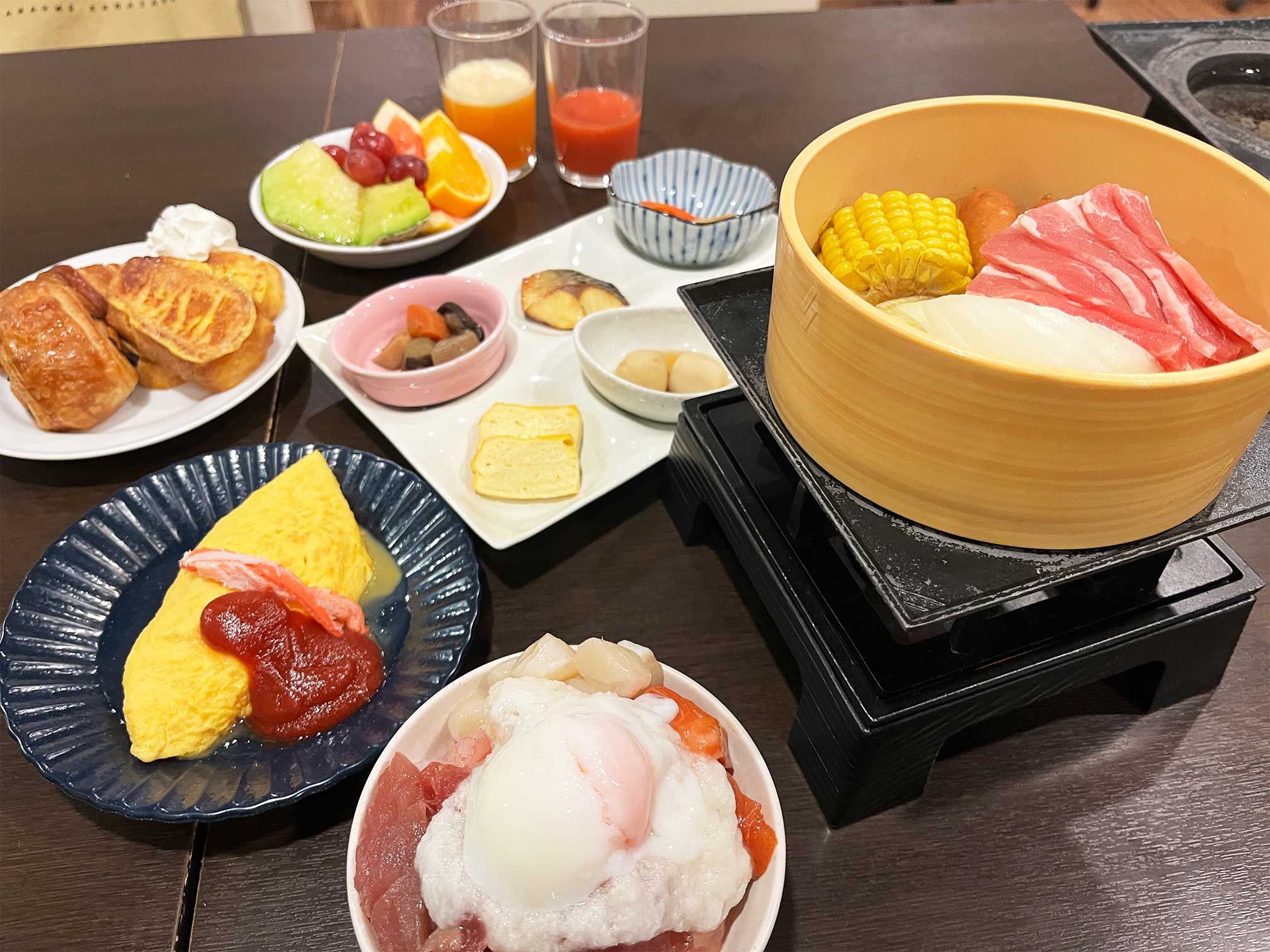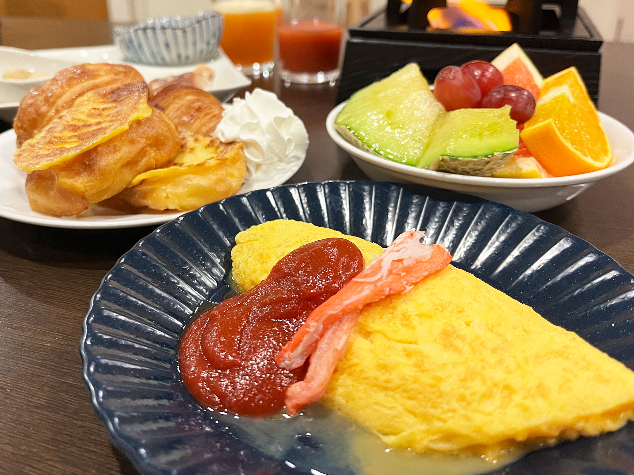 そのほかカニ飯、カニ汁、自家製赤肉メロンスムージー、焼きたてパン、焼き魚、種類豊富なフルーツなんて、胃袋がどれだけあっても足りません。
